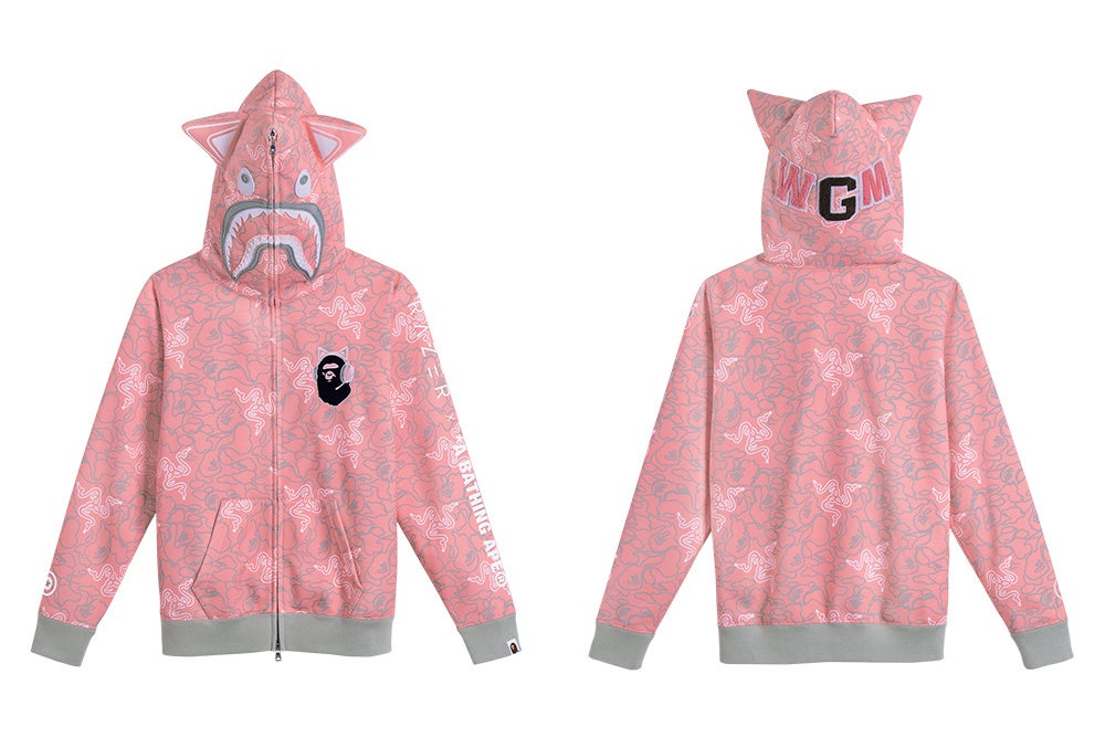 ファッションラインナップのキーアイテムであるシャークフルジップフーディは、BAPE®のWGM(World Gone Mad)モチーフを採用し、ピンクのQuartzバージョンには、人目を引くネコミミも付いています。どちらのパーカーにも「A Gaming Ape」の刺繍ワッペンが施されています。