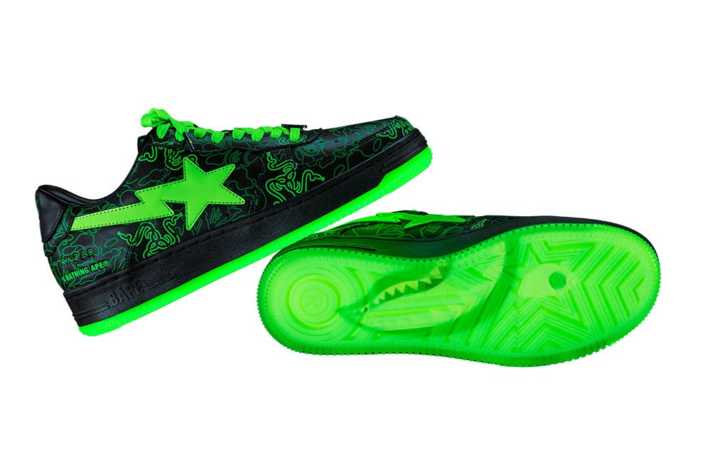 BAPE STA™は、BAPE®の特徴であるシャークのデザインを靴底にあしらい、サイドにはBAPE STA™のSTAロゴがあしらわれ、ストリートをスタイリッシュに彩るスニーカーです。さらに暗闇ではRazerグリーンに発光し、BAPE®とRazerのトリプルヘッド・スネークのロゴがコラボレートしたカモ柄を照らします。