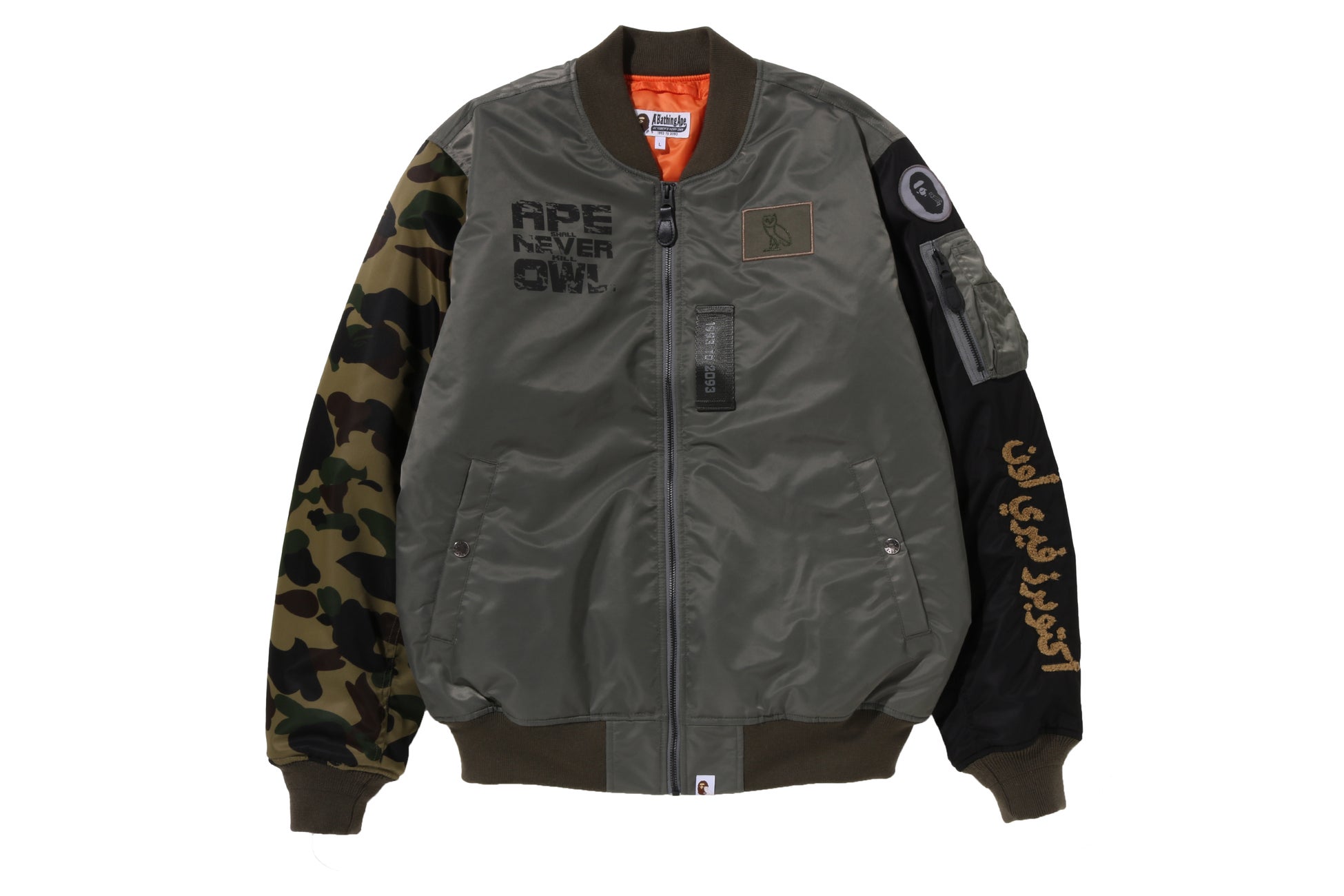 MA-1ジャケットは右袖を1ST CAMO、左袖にOVO®︎のアラビア文字を配したアシンメトリーな仕上がりが特徴で、胸元にはBAPE®︎の代表的なスローガンをひと捻りした「APE SHALL NEVER KILL OWL」のかすれ文字をプリント。