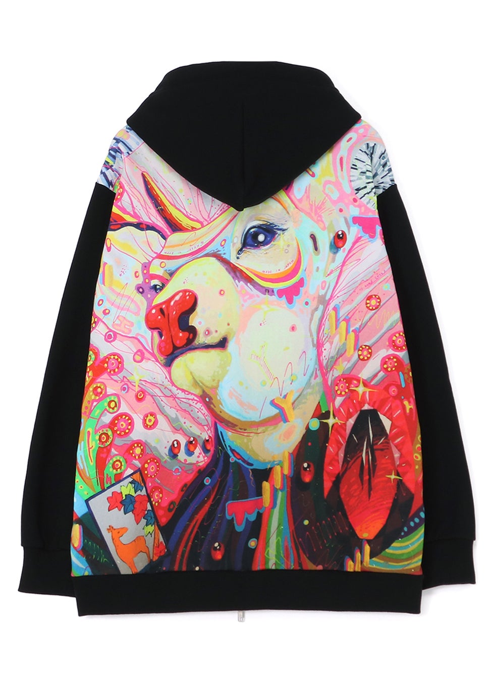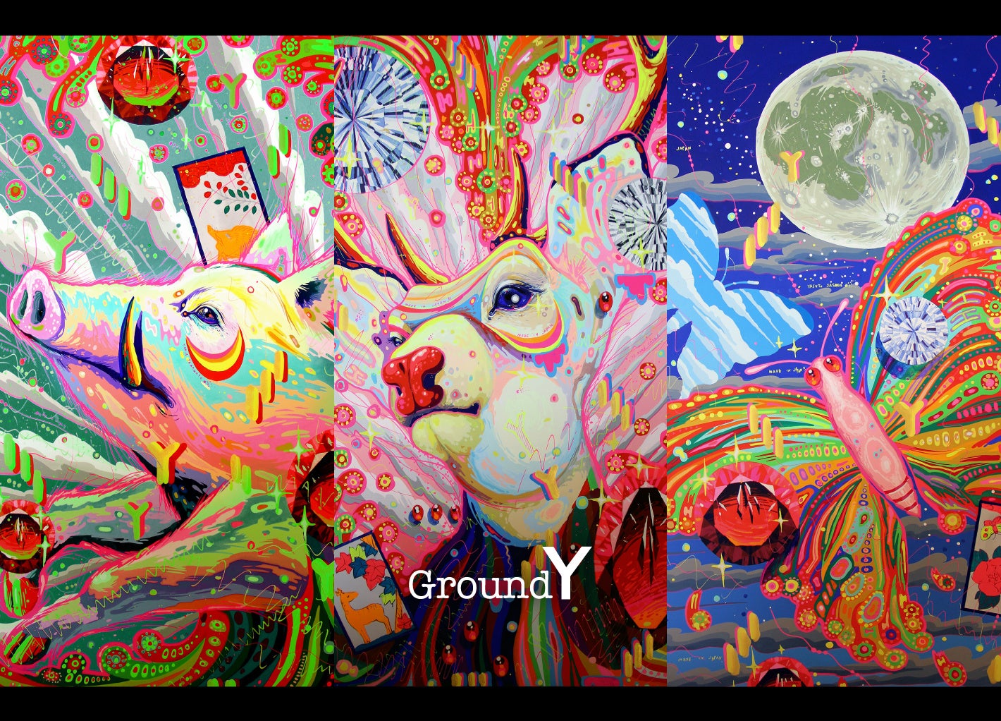 ゆかりの地、奈良県の鹿を題材にした「ナラシカ」シリーズの配色と構図をベースに、縁起物である「猪」「鹿」「蝶」の3種のモチーフが描かれた笹田氏の作品を、Ground Yならではのグラフィックとしてフーディー、カットソー、トートバッグに落とし込んだ、新春を祝うにふさわしい華やかなコレクションです。
