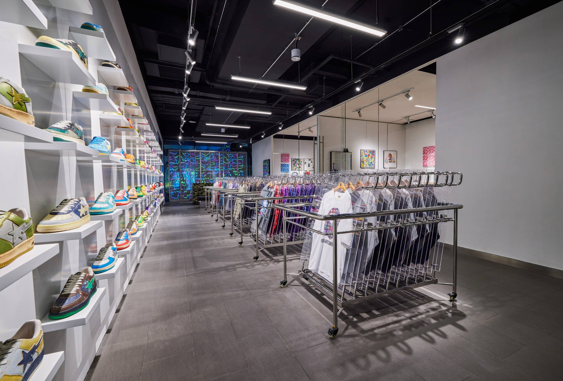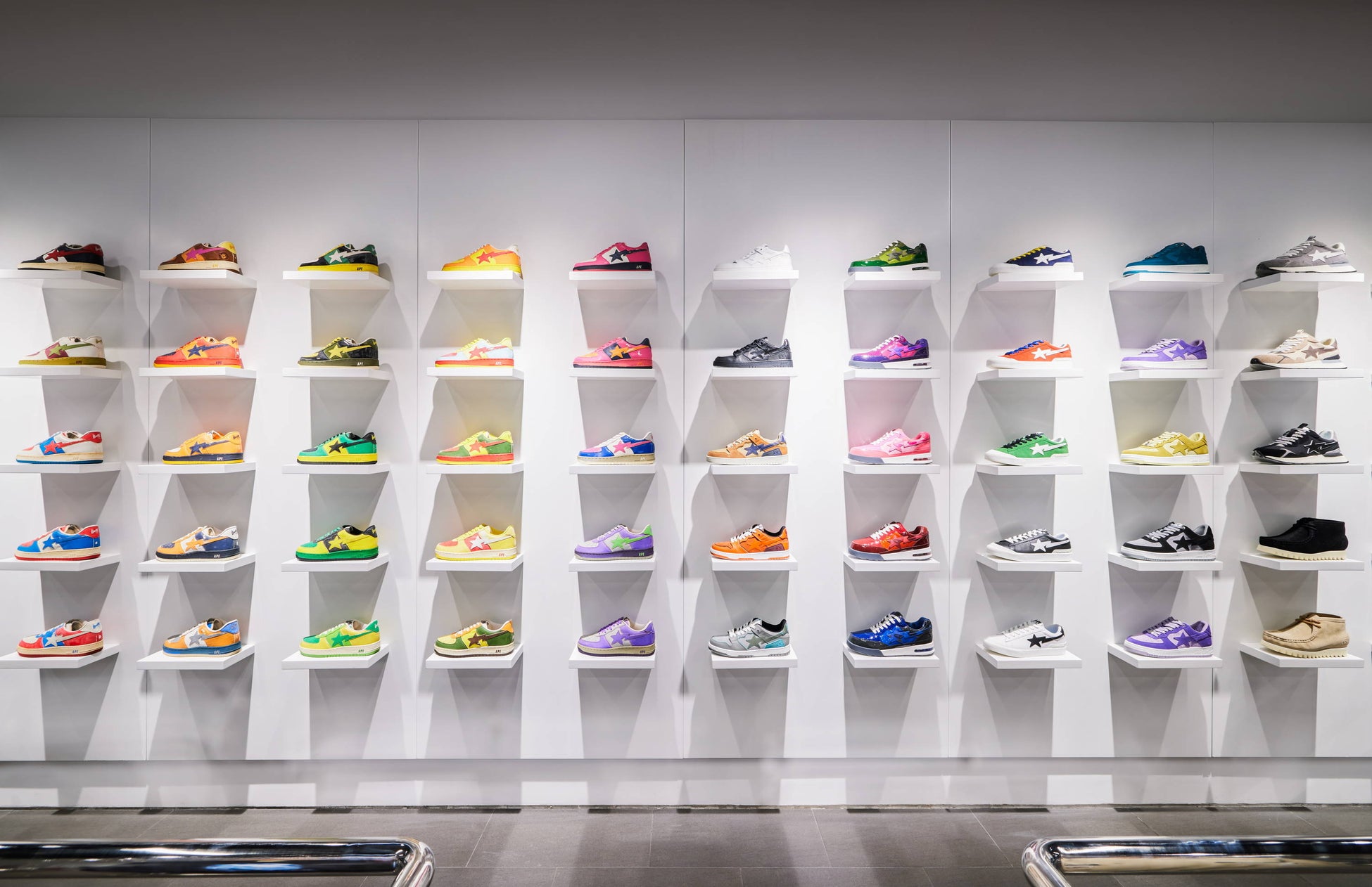 40足のBAPE STA™️が展示されたインパクトのある壁面が設置されたBAPE®︎ MERCHANDISEエリア。BAPE STA™️の新作スニーカーやアパレルの販売も予定されています。