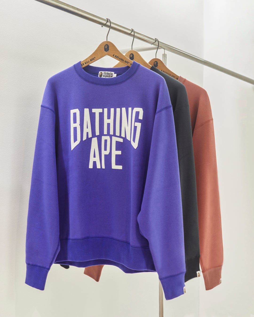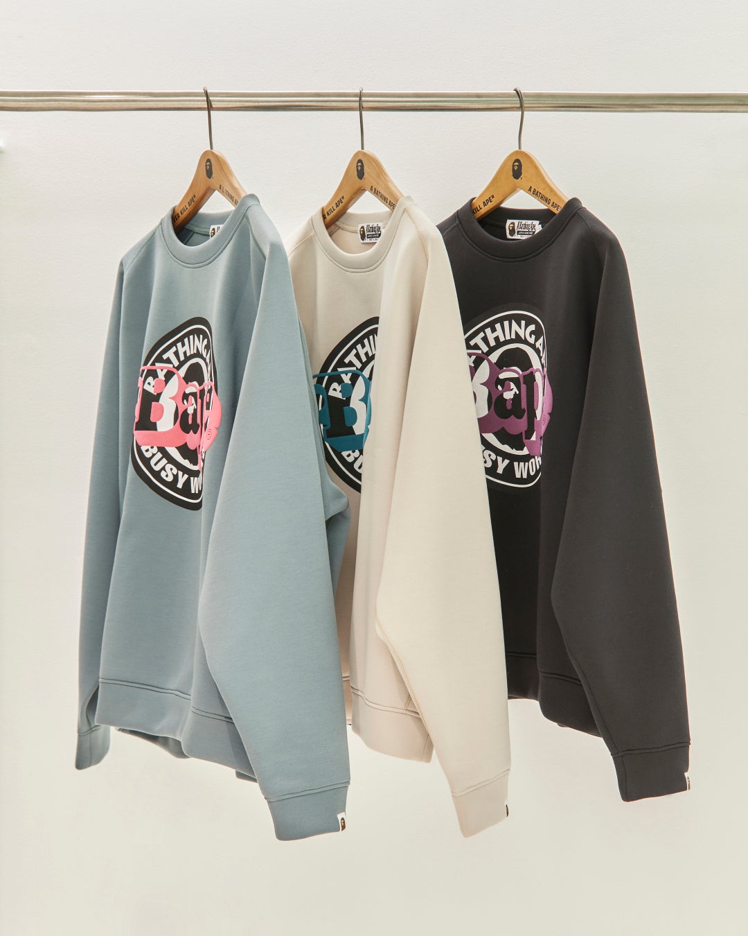 表面をハイゲージで編み上げており、上品な光沢感が特徴の生地感。フロントにBATHING APEのNYC風ロゴのフェルトアップリケを叩きつけ、背面襟下にBUSY WORKSロゴのグラフィックをラバープリントで表現したデザイン。左袖にピスネームを配置。身幅にゆとりのあるシルエット。3色6サイズ展開。