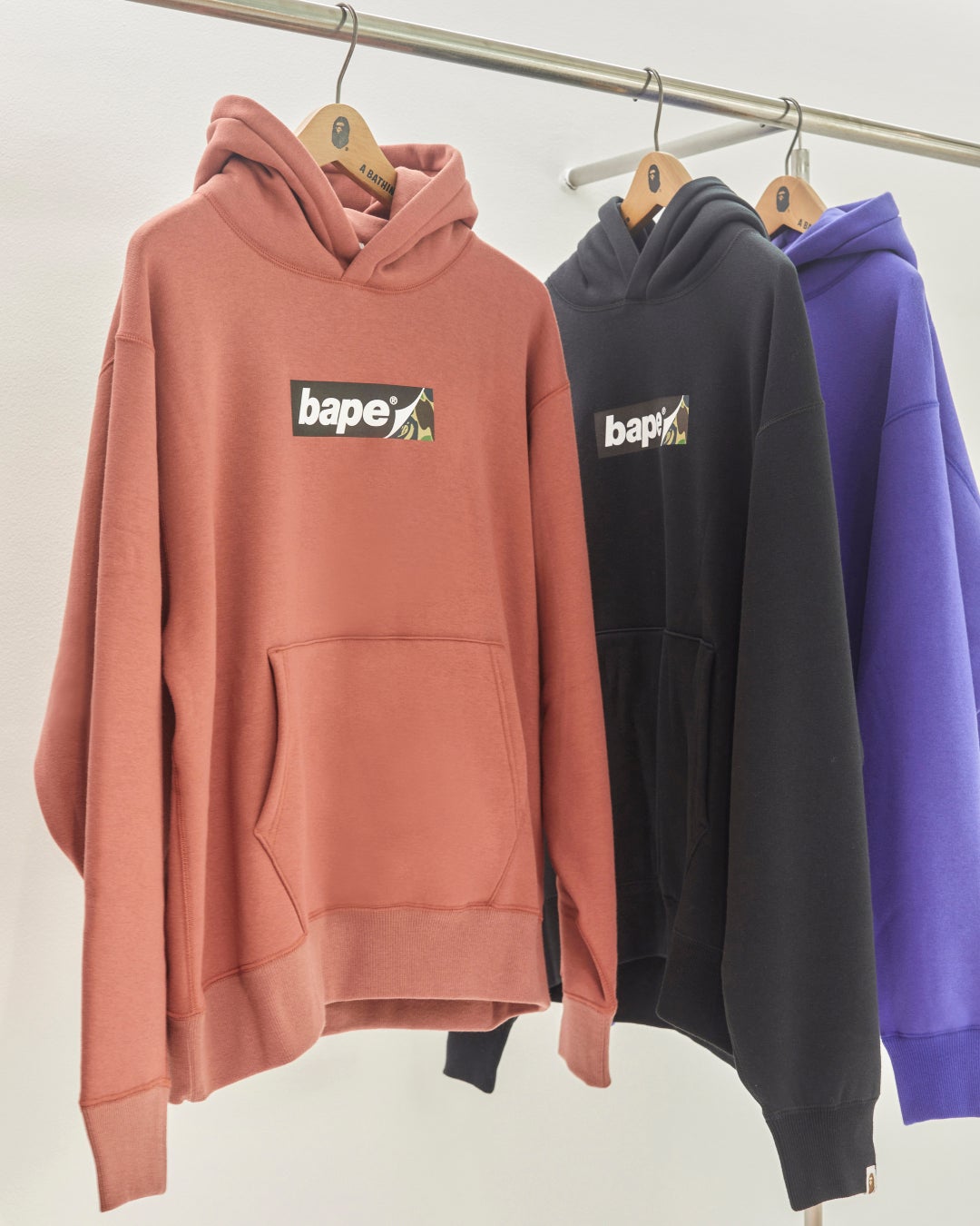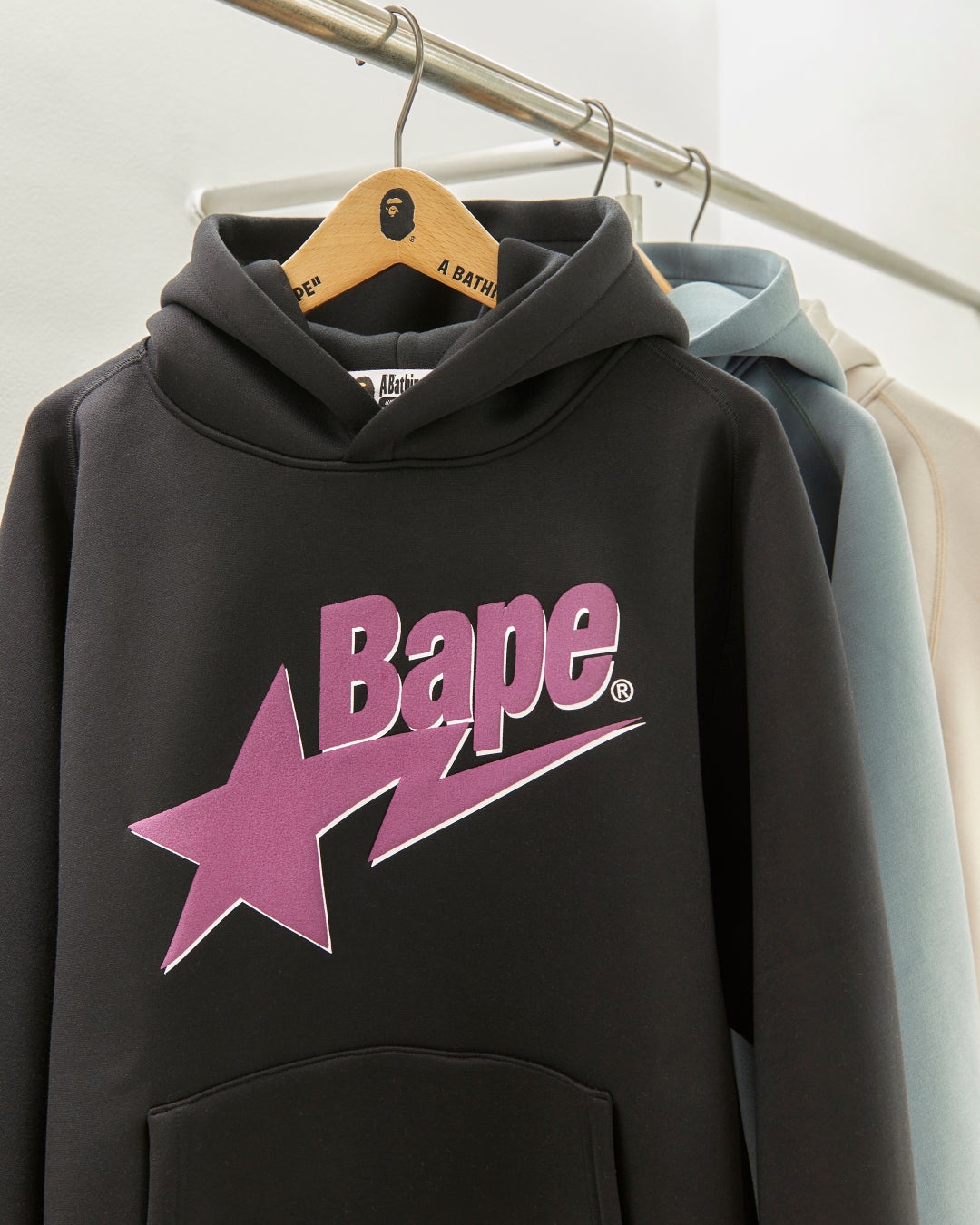 前身頃にBAPE STA ロゴグラフィックを発泡プリント、影部分をラバープリントで表現したデザイン。さらに腹部にマフポケット、左袖にピスネームを配置。腕の動きが自由になるように肩から腕へS字の曲線を描くように縫われたフリーダムスリーブを採用した身幅にゆとりのあるシルエット。3色6サイズ展開。