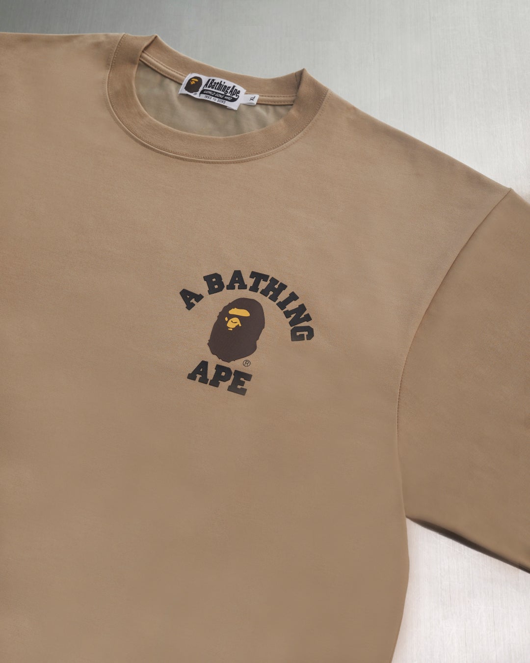 左胸にAPE HEAD、アーチ型ブランドロゴのグラフィックを厚盛りプリントで表現したデザイン。襟ぐりはバインダーネック仕様、左袖にピスネームを配置した仕様。
