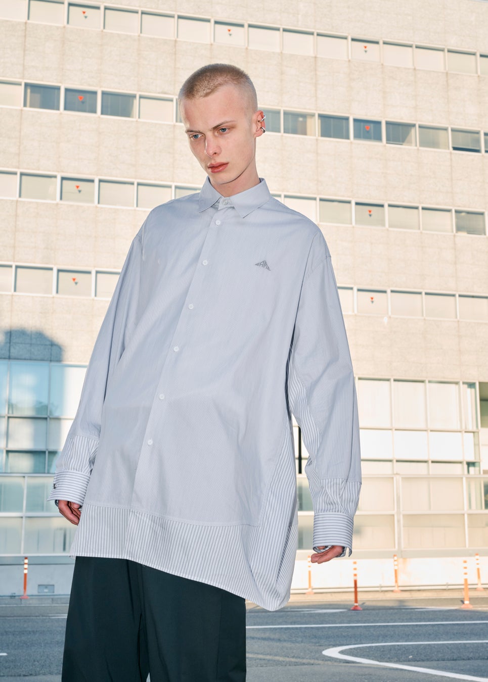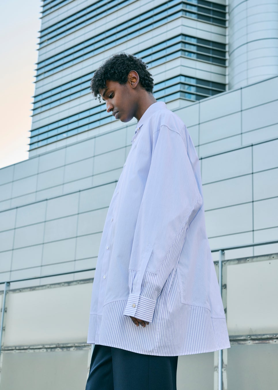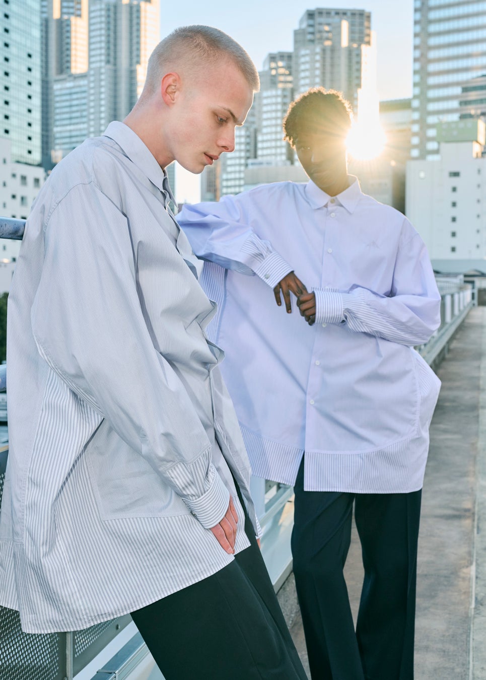 パネル構造の仕立てや胸元のロゴ刺繍はそのままに、マイクロストライプのイタリア製コットンのポプリンを用いて、ホワイトグレーとライトパープルの2色を展開いたします。