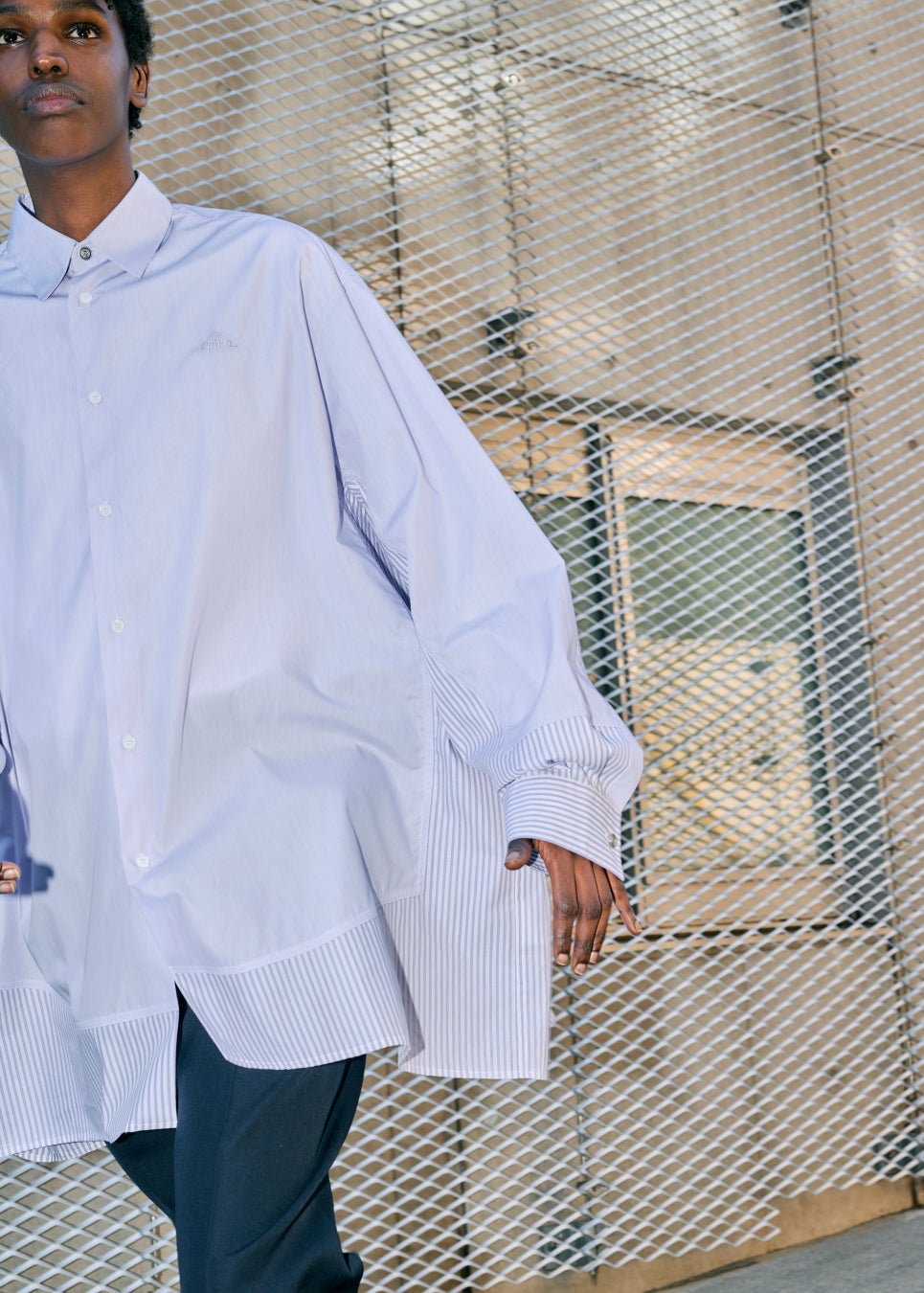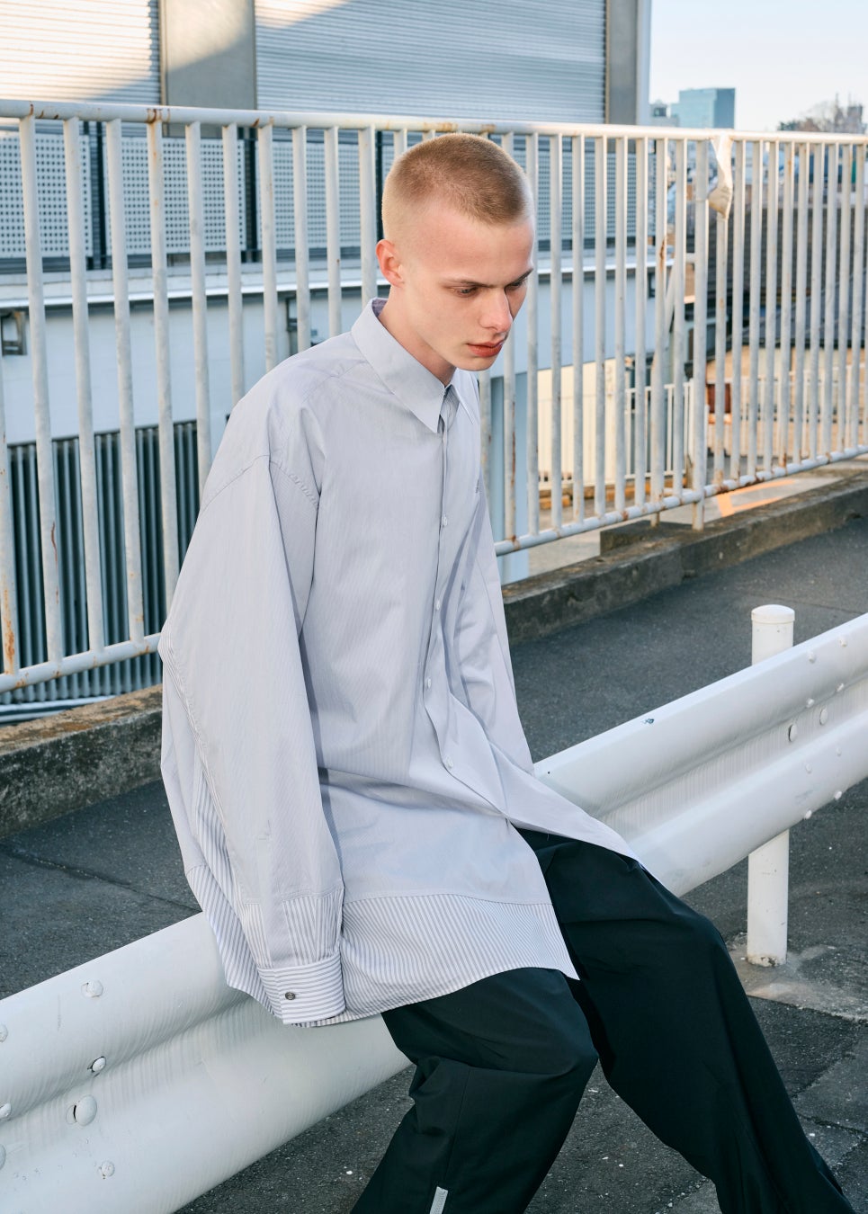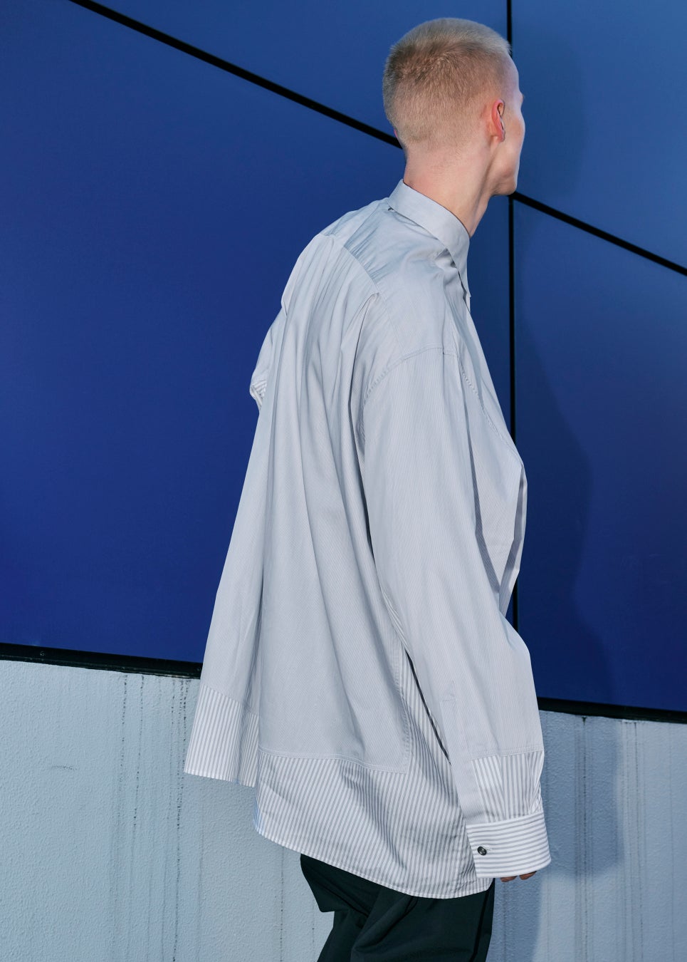 パネル構造の仕立てや胸元のロゴ刺繍はそのままに、マイクロストライプのイタリア製コットンのポプリンを用いて、ホワイトグレーとライトパープルの2色を展開いたします。