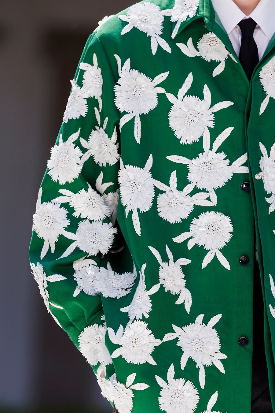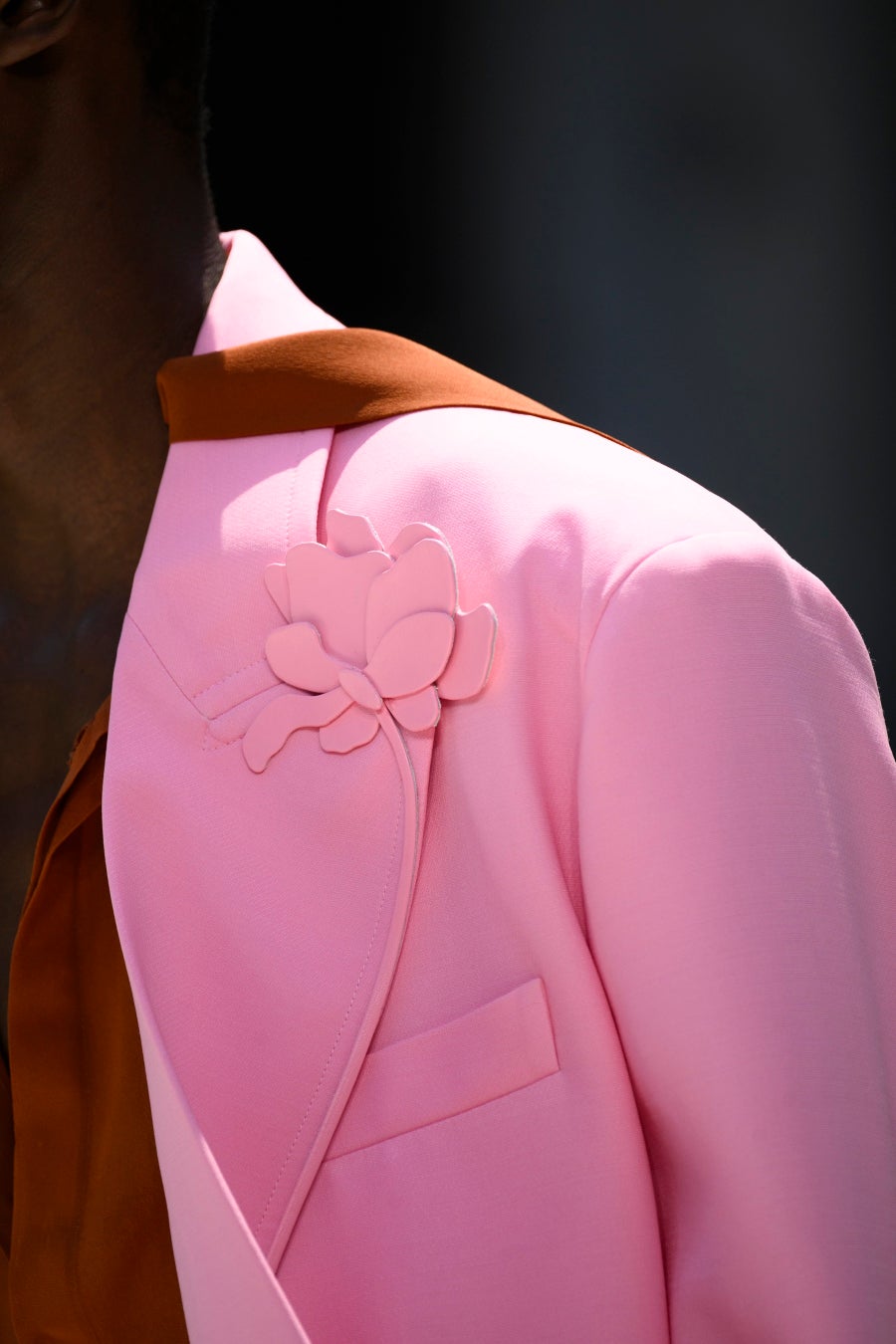 元々の在り様から変化し、ネクタイのようにシャツに留められたロマンティックな花。不完全性を称え、修理することによって繊細さを強みに変えるという日本の金継ぎにインスピレーションを得てデザインされたこの花は、まるで記憶で作られたかのように、人の強さを称えます。