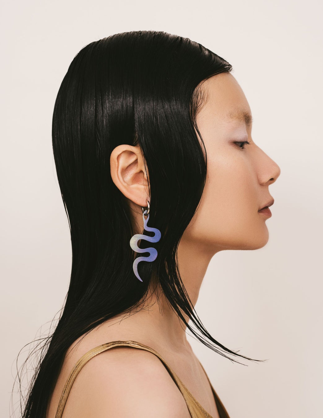 自己の確立=個性を表現するため、敢えて仕上がりに個体差の出るグラデーションに染め上げました。一つ一つのパーツを丁寧に手仕事で染めたデザインです。