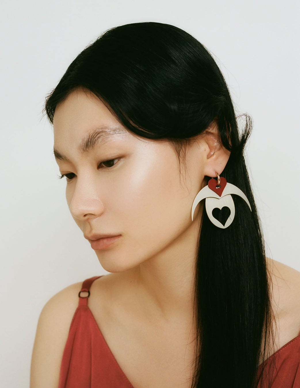 燃える情熱を象徴する赤いハートと、それを守るように周りに配されたシャンパンゴールド。円弧で構成された、柔らかさとシャープさが共存するカッティングです。